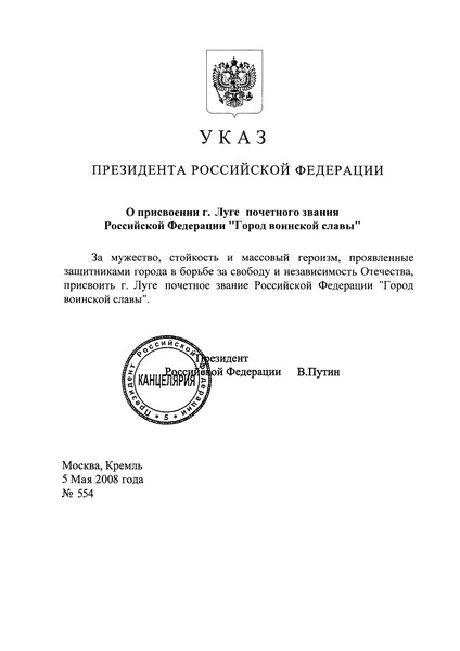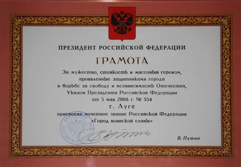 5 мая 2008 года Указом Президента РФ Луге было присвоено почетное звание «Город воинской славы».