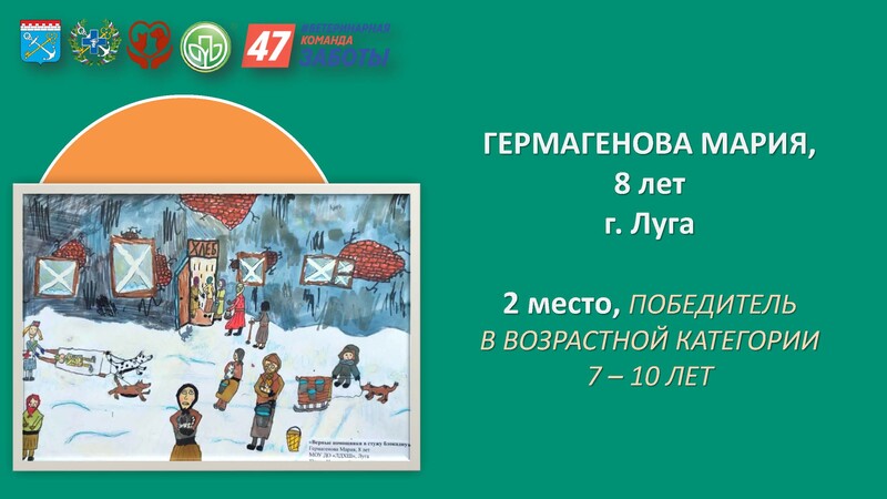 В младшей категории ученица Лужской детской художественной школы Мария Гермагенова заняла 2 место. В возрастной категории 11-14 лет 1 место завоевала Кристина Петрова, воспитанница Центра детского и юношеского творчества. 2 место у Кристины Кирилловой, ученицы Лужской школы-интерната.