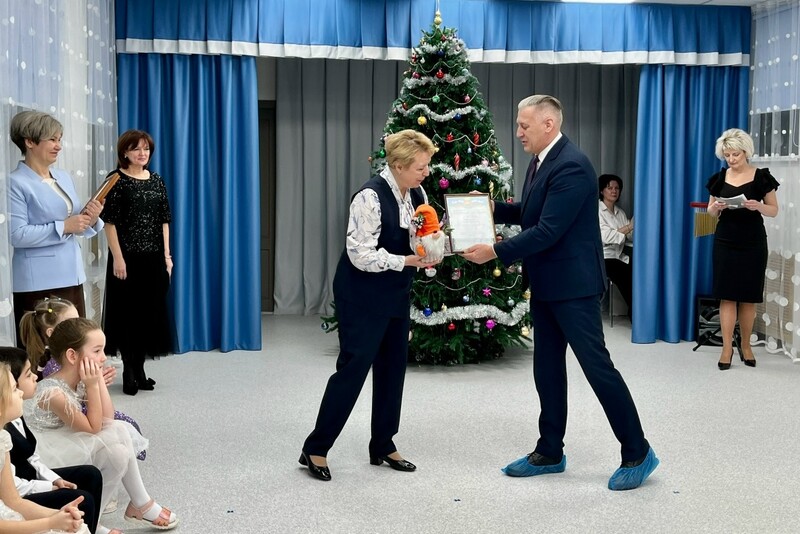 А.В. Голубев вручил руководителю учреждения Г.Ю. Мельник игрушку-оберег. Подобные сувениры в Лужском районе дарят всем отремонтированным учреждениям.