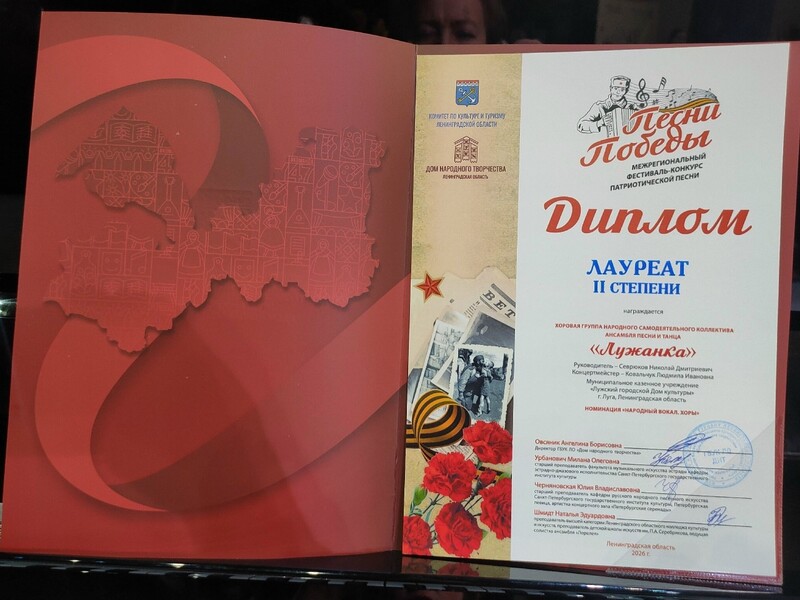 Хоровая группа ансамбля песни и танца «Лужанка» Лужского городского Дома культуры в финале конкурса выступила с песней «Будь ты проклята, война». Коллектив награжден дипломом лауреата 2 степени.